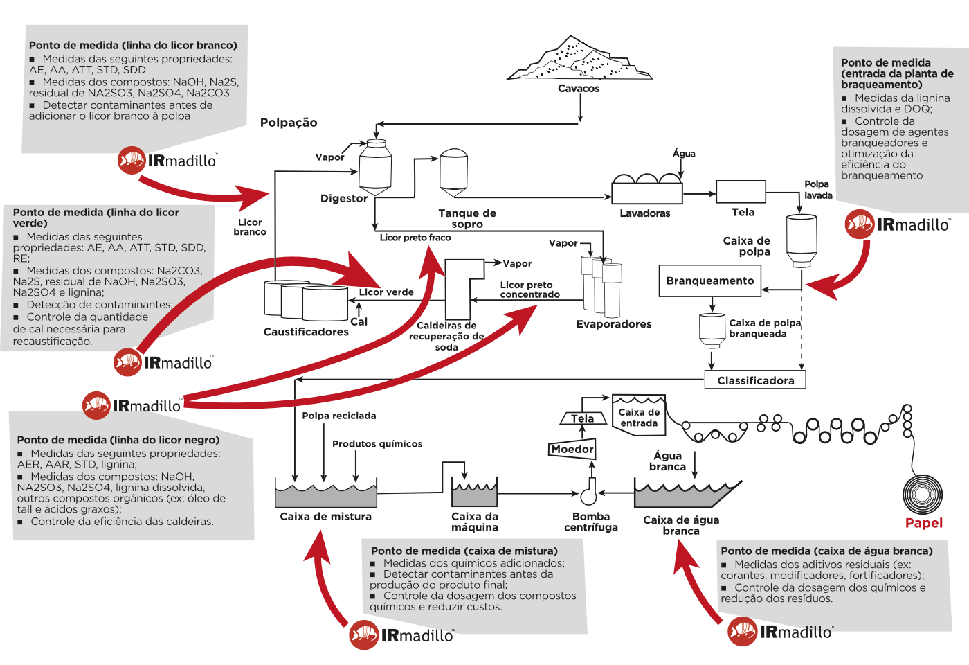 A polpa lavada pode ser tanto usada diretamente para criar as placas de celulose, quanto após o branqueamento pode ser usada pra fabricação de diferentes tipos de papel. O branqueamento envolve um combo de produtos químicos como NaOH, dióxido de cloro (ClO2) e água oxigenada (H2O2). Por fim, a polpa branqueada é misturada com aditivos – como, derivados de celulose ou aditivos poliméricos) para atingir as propriedades desejadas no produto final antes da criação de bobinas. A água branca residual que aparece após a etapa da máquina de papel é reciclada e completado com aditivos químicos adicionais. Um resumo do processo Kraft é mostrado acima com os pontos de instalação pro IRmadillo sugeridos.